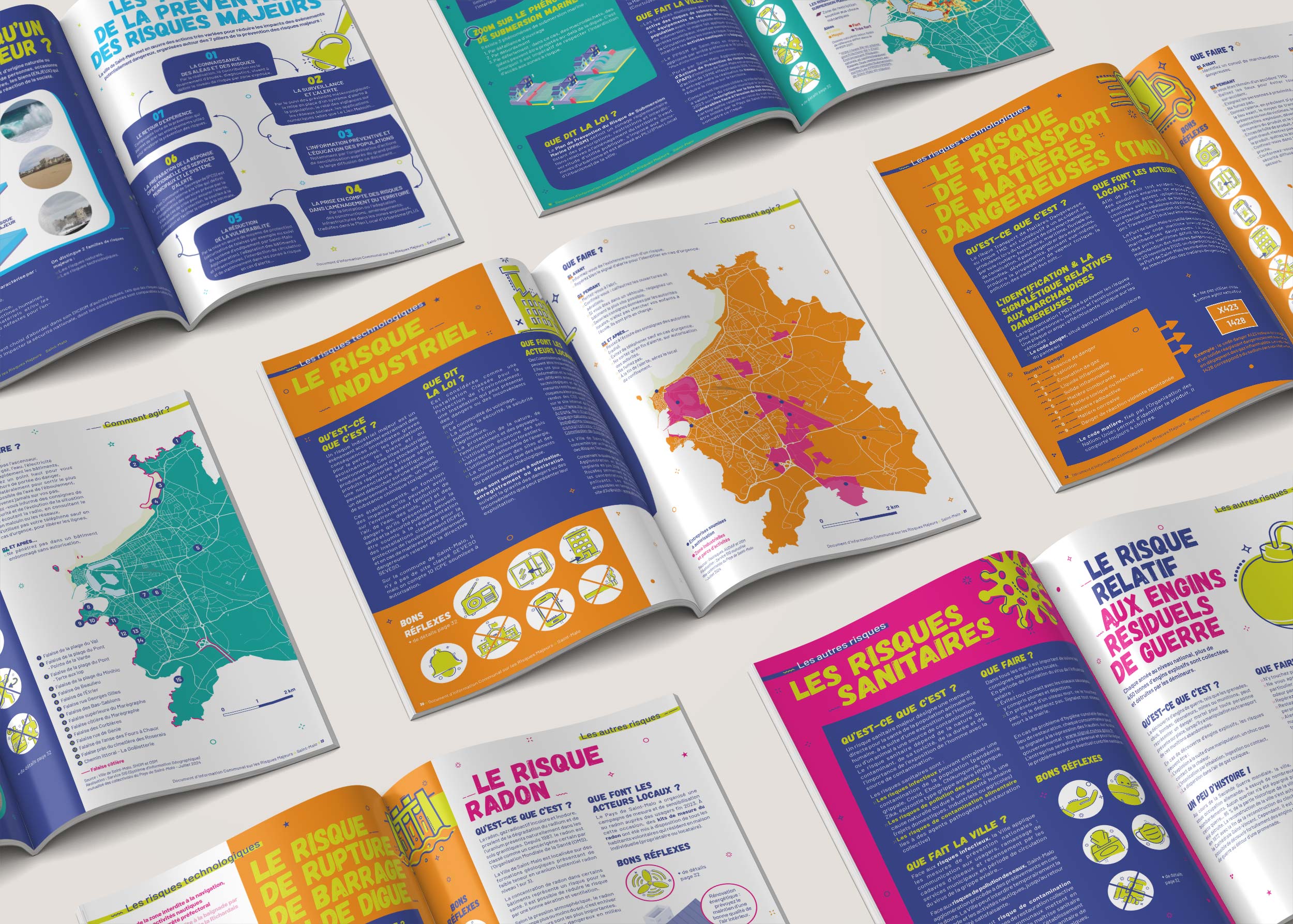 Nous avons choisi de contrebalancer un contenu susceptible d’être anxiogène par un univers graphique ludique et coloré, rythmé par des pictogrammes et une typographie décalée, afin de conserver un ton institutionnel tout en restant simple et clair.