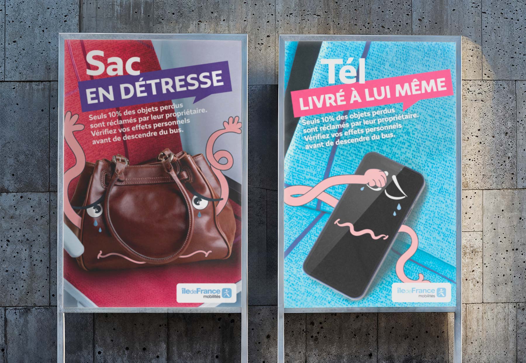 Campagne de sensibilisation des usagers sur l'oubli de leurs objets personnels dans les transports en commun, avec un concept de personnification des différents objets les plus oubliés dans le bus.