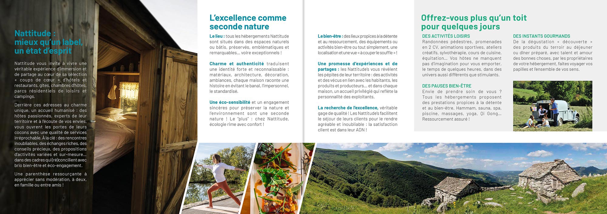 Née en Auvergne, la marque Nattitude met en lumière les hébergeurs qui témoignent d’une destination touristique préservée, insolite et naturelle. Ces hébergements sont les « pépites » de la destination de vacances : atypiques, identitaires, éco-responsables et incontournables, pour tous ceux qui souhaitent se ressourcer et vivre leur séjour comme une vraie expérience