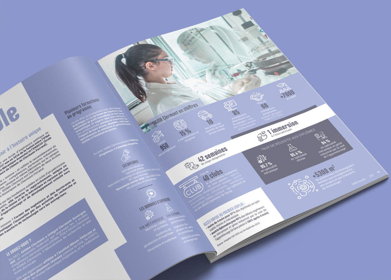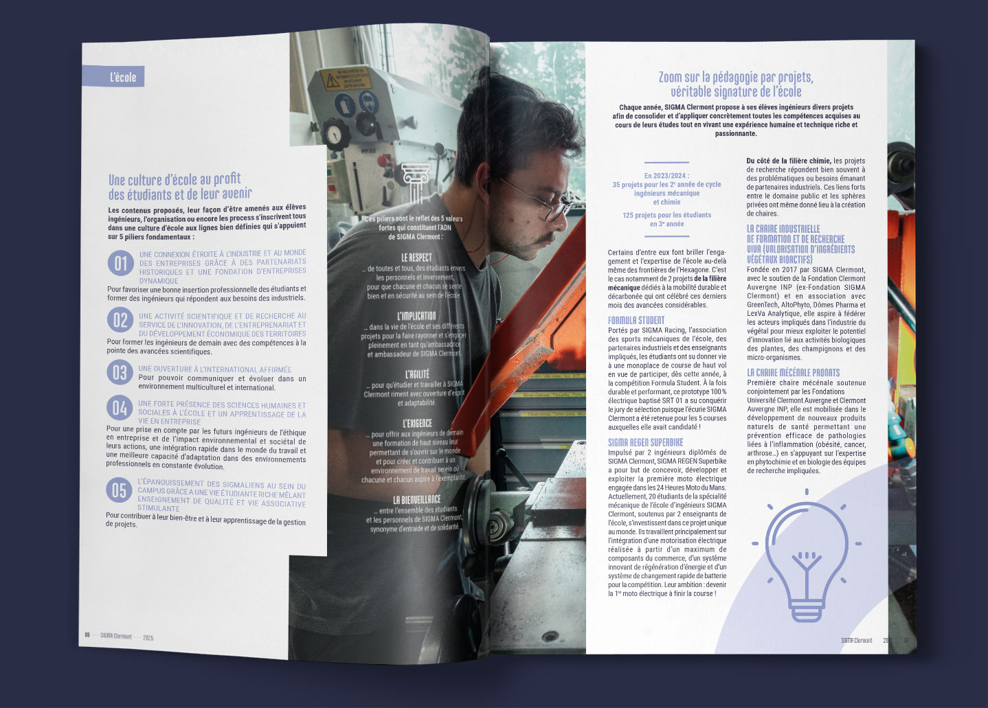 Design institutionnel, avec une mise en avant des photos, avec un jeux des aplats avec les photos et les textes. Les pictogrammes viennent illustrer des textes clés et rendre la mise en page plus ludique et moins froide.